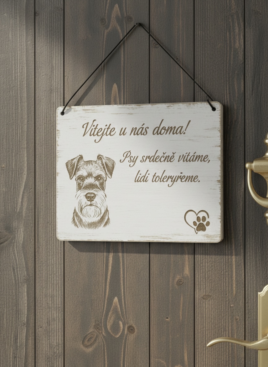 Originální dřevěná cedulka na dveře vyrobená na míru podle fotografie vašeho psa. Každý kus vzniká ručně v naší dílně, s důrazem na detail, kresbu srsti i výraz mazlíčka. Díky tomu je každá cedulka skutečný originál.