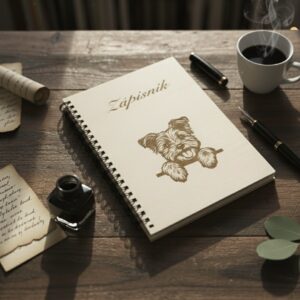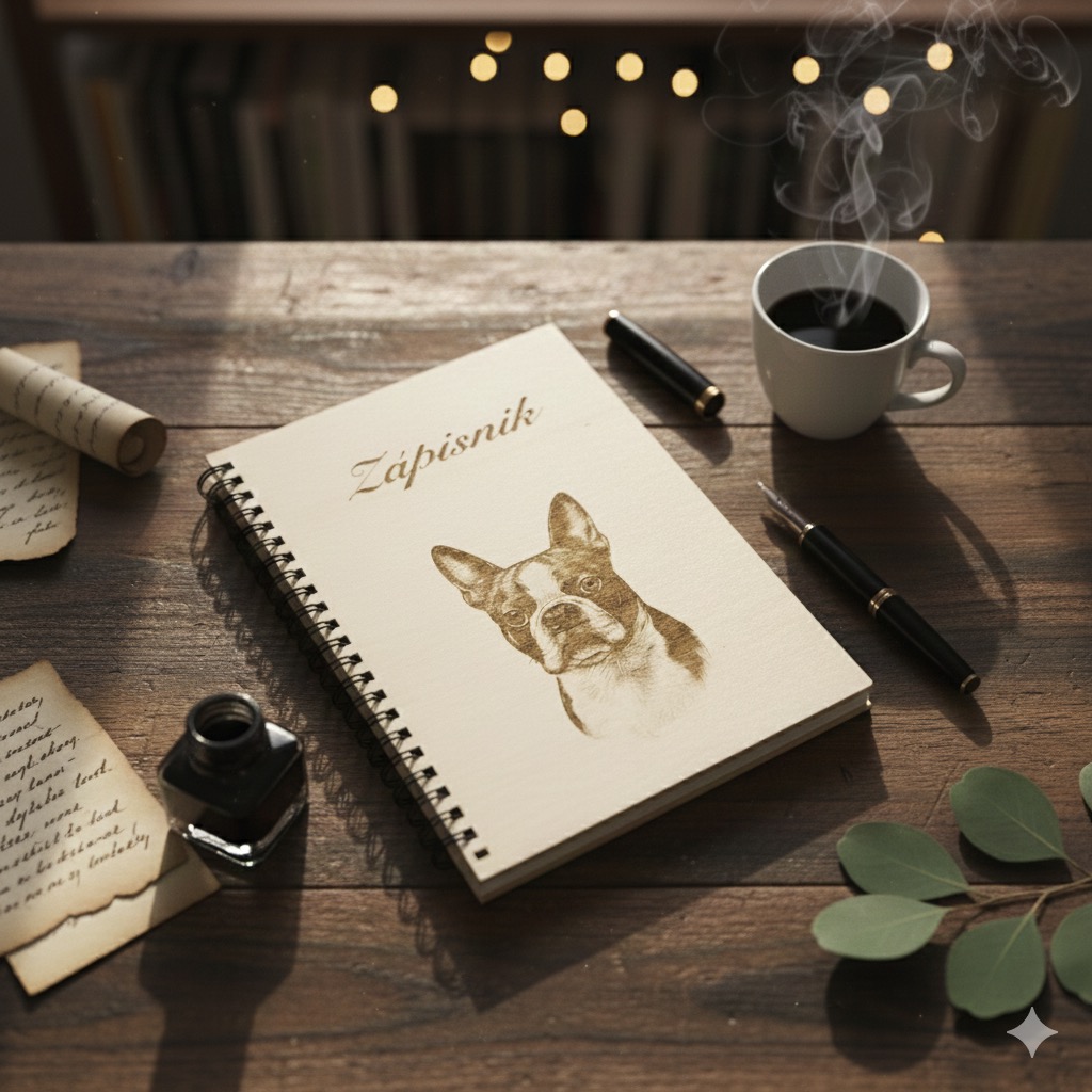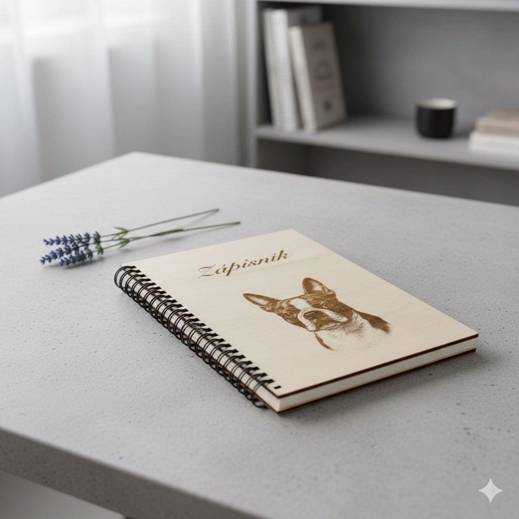 Na přední straně je precizně gravírovaný motiv pejska, který v sobě spojuje eleganci dřeva a radost ze života. Desky jsou vyrobené z kvalitní překližky, pečlivě broušené a ošetřené tak, aby zápisník vydržel roky.