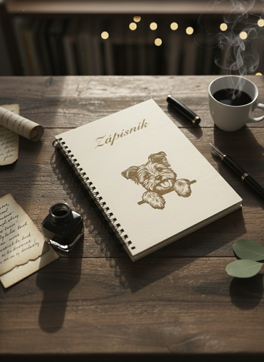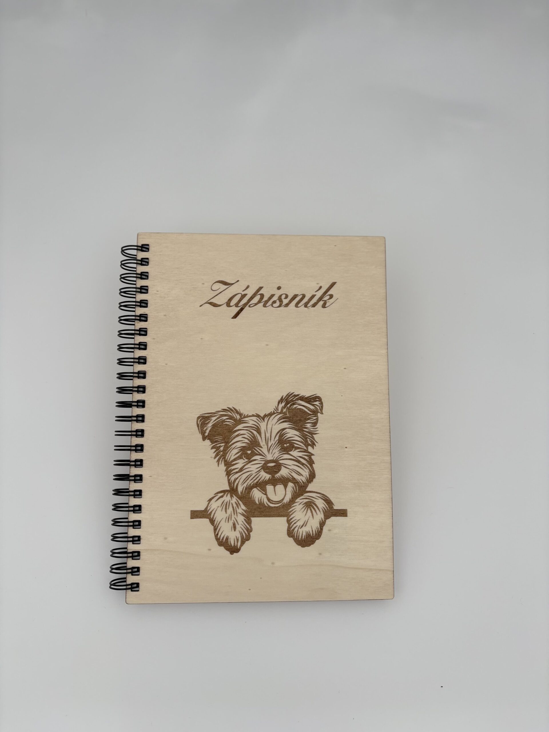 Stylový dřevěný zápisník s gravírovaným motivem jorkšírského teriéra potěší každého, kdo miluje psy nebo hledá originální doplněk pro své myšlenky.